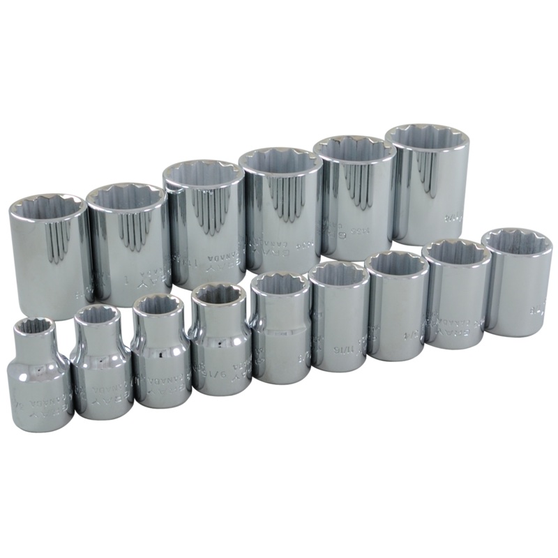Contains Sizes: 3/8", 7/16", 1/2", 9/16", 5/8", 11/16", 3/4", 13/16", 7/8", 15/16", 1", 1 1/16", 1 1/8", 1 3/16", 1 1/4".Drive Type: 12 PointDrive Size: 1/2"Mirror chrome finish for maximum resistance against corrosion.Made from premium tool steel for maxi