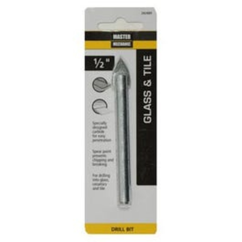 Master Mechanic, 1/2" x 3-1/4", Glass & Tile Carbide Tipped Drill Bit, Spear Pointed Tip Reduces Breakouts When Drilling From 1 Side To The Other, May Be Used With Any 3/8" Drill Press Or Variable Speed Drill, Zinc Finish, Recommended For Use In Ceramic Ti