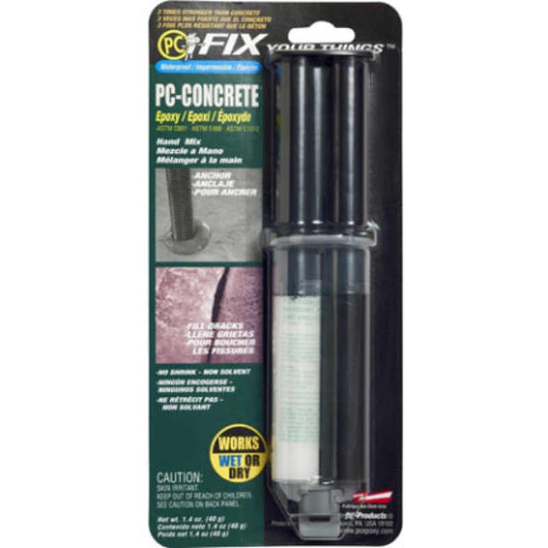 PC Concrete epoxy gel is a two-part anchoring and concrete repair product. Formulated for anchoring threaded rods, bolts, rebar dowels and smooth dowels into concrete, grout filled block, and unreinforced masonry. Has exceptional strength, maximum field reliability, along with a high heat deflection temperature of 134F, which provides engineers and contractors with a choice for specifying and setting adhesive anchors in elevated temperature environments. Gray. 1.4 oz. syringe.