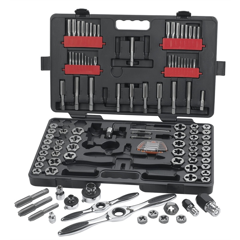 114 Piece Large SAE and Metric Ratcheting Tap and Die SetFeatures and Benefits: 5 degree ratcheting arc with reversible lever eliminates hand over hand turning Patented Twist Lock guide system reduces "back walk" of die guide Extension adapters provide acc