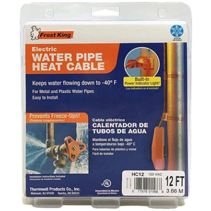 12 feet, 120V, 7 Watts per foot. Keeps water flowing down to (-40) degrees F. For metal and plastic water pipes. Easy to install. Black.