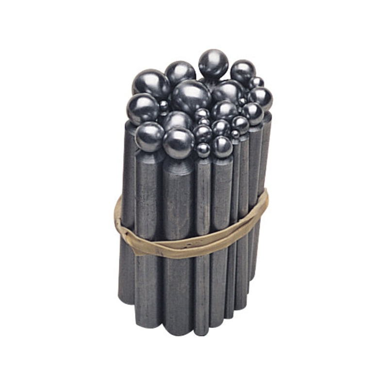 Made of tool steel and case hardened, this set of 18 punches are used with dapping dies and blocks to shape metals; features depressions that range from 7/64″ to 7/16″.