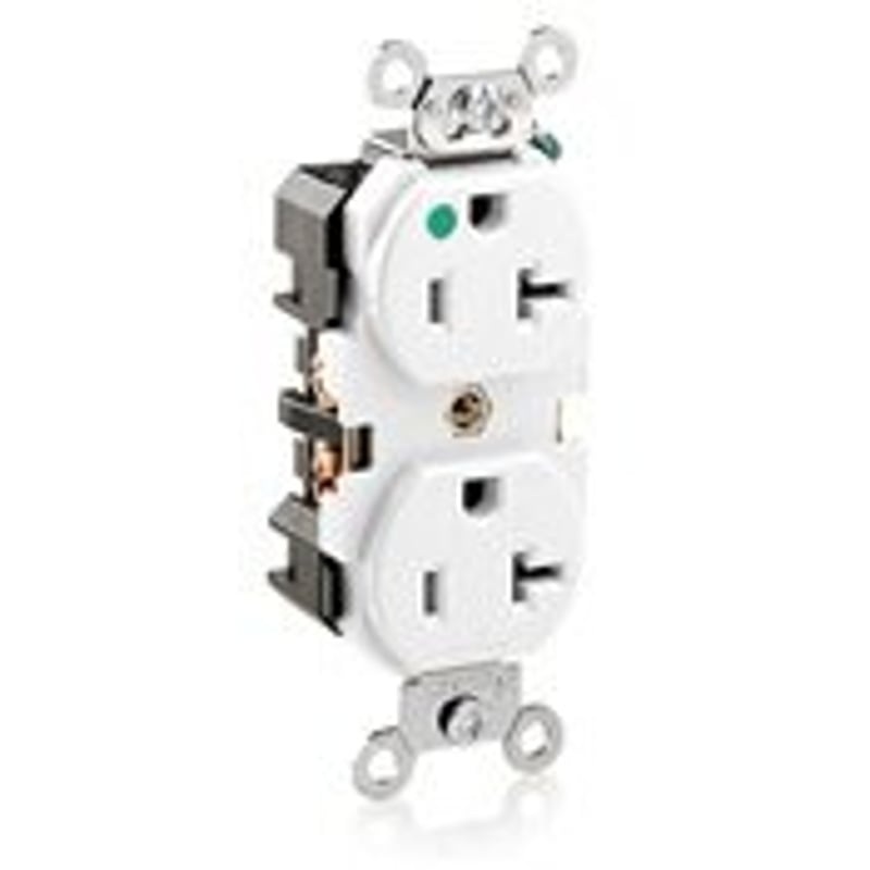 Duplex Receptacle, Hospital Grade, 20 Amp, 125 Volt, NEMA 5-20R, 2-Pole, 3-Wire, Narrow Body Straight Blade, Heavy Duty, Self Grounding, Back & Side Wired, Steel Strap - WhiteVolts AC: 120Amps: 20Color: WhiteNEMA Configuration: 5-20R