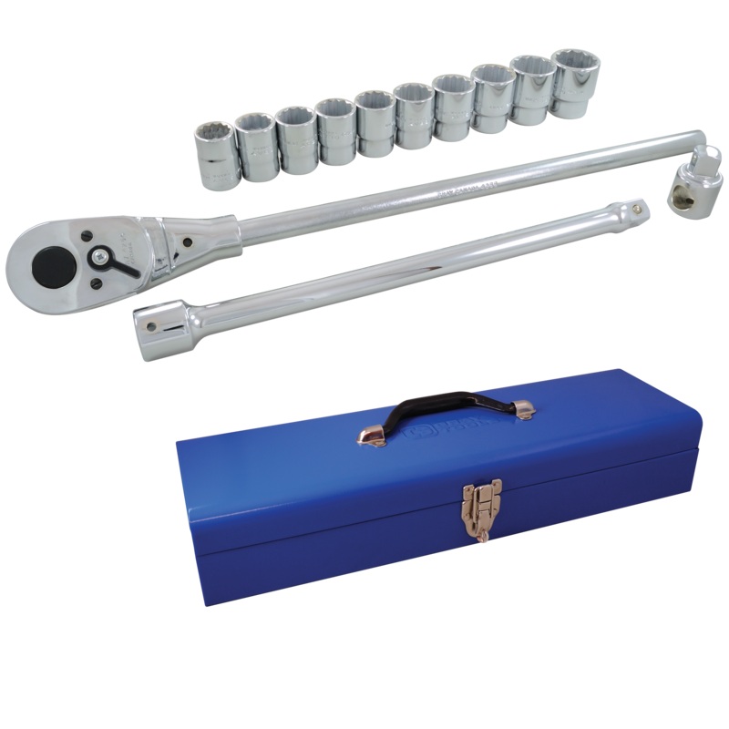 Contains:24, 25, 26, 27, 28, 29, 30, 32, 35, 36mm socketsReversible Ratchet Head, Handle, Sliding T-head, 8" Extension.Drive Type: 12 PointDrive size: 3/4"Mirror chrome finish for maximum resistance against corrosion.Made from premium tool steel for maximu