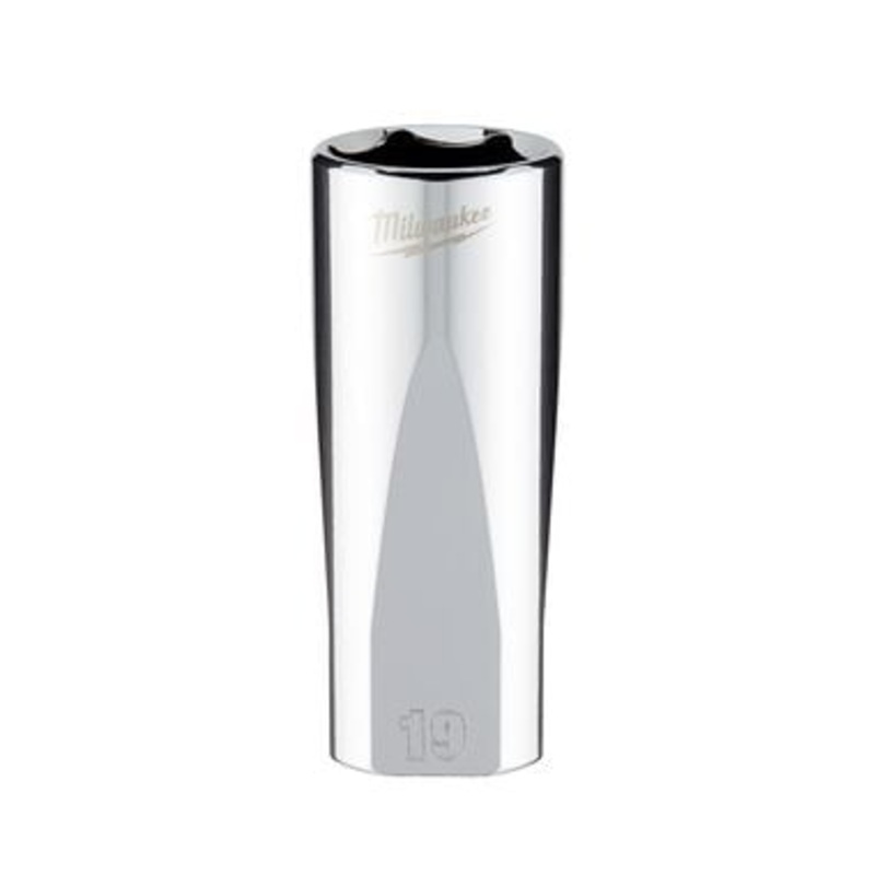 The Milwaukee 3/8 in. drive 19mm metric 6-point deep socket was designed from the ground to be part of the most versatile socket family. The innovative socket design has four parallel flat sides, which deter rolling and are wrench-compatible. Socket sizes