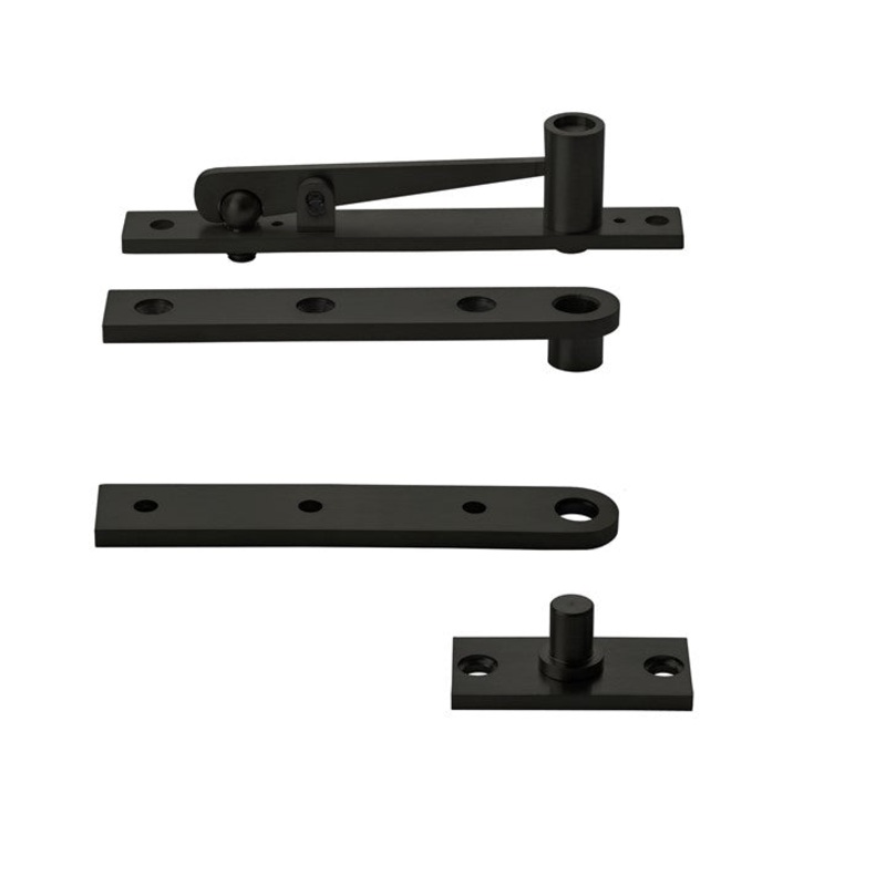 Pivot hinges attach top and bottom of a door where the door is to swing open in both directions. The hinge pivots on a single point of axis rather than rotate around a pinFull-cast 304 stainless steel constructionMatt Black finishLoad bearing weight up to