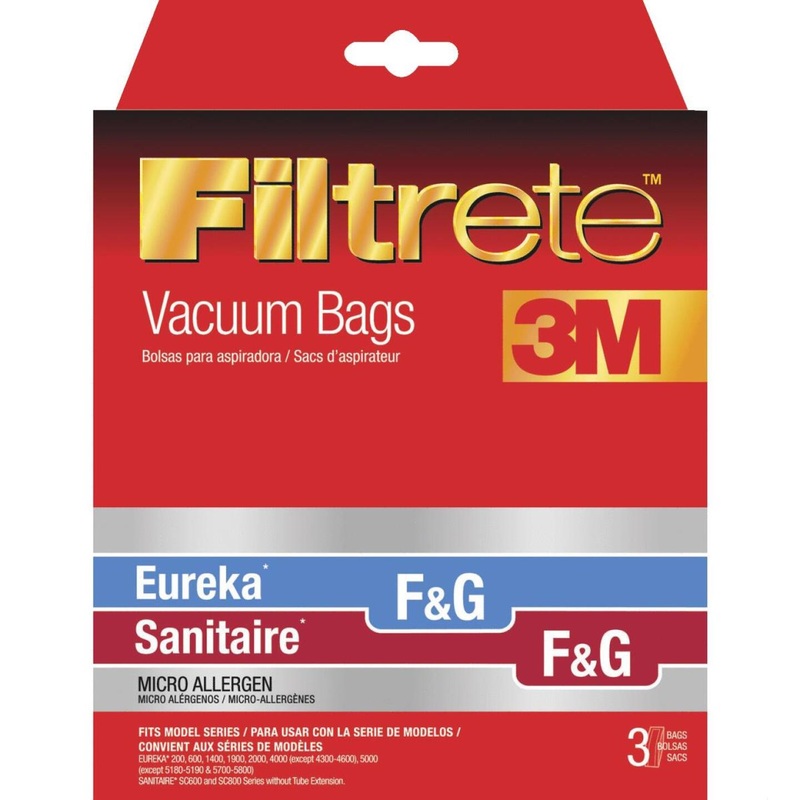 Replacement bag for Eureka/Sanitaire vacuums. From the air your vacuum pulls through the bag, Filtrete Micro Allergen vacuum bags capture 94% of particles larger than 1 micron size, including dust mite debris grass, and ragweed pollen. They also capture 57% of particles between 0.3 and 1 micron in size, including household fibers and other microscopic allergens. Fits Eureka 200, 600, 1400, 1900, 2000, 4000 (except 4300 – 4600), 5000 (except 5180 – 5190 and 5700 – 5800) Series upright. Sanitaire SC600 and SC800 Series without tube extension. 3 bags per package.