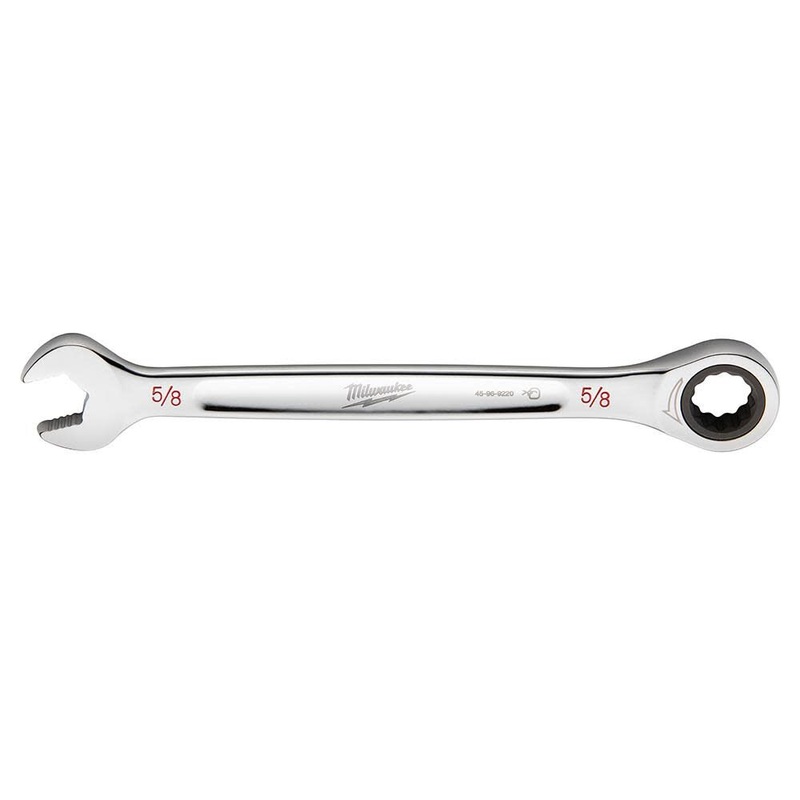 The MILWAUKEE 5/8 in. SAE Ratcheting Combination Wrench features 2.5 degrees of arc swing and 144 ratcheting positions, allowing quick and efficient work in tight spaces. This wrench has double-stacked pawls within the ratcheting mechanism, which increases