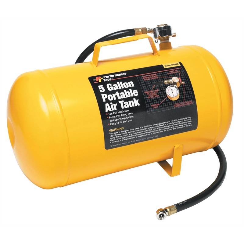 5 Gallon Portable Air TankFeatures and Benefits: 125 PSI maximum Lightweight, portable with handle for easy transport Safety pressure bypass valve with manual override On/Off air adjustment dial Industrial grade air hose with standard tire air chuck Hi-Viz