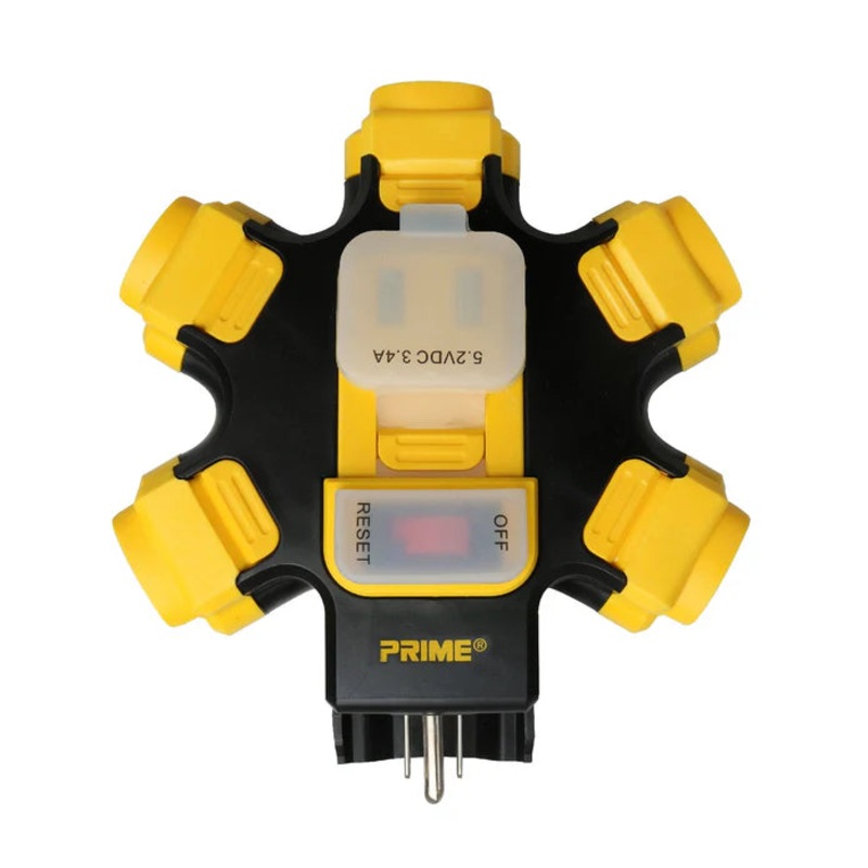 Imagine powering 5 tools from one extension cord while charging 2 cell phones at the same time. Now you can with Prime's Power Hub! It has a built-in 2-port USB charger, weather & water resistant outlet covers, and when plugged into a 12 gauge extension co