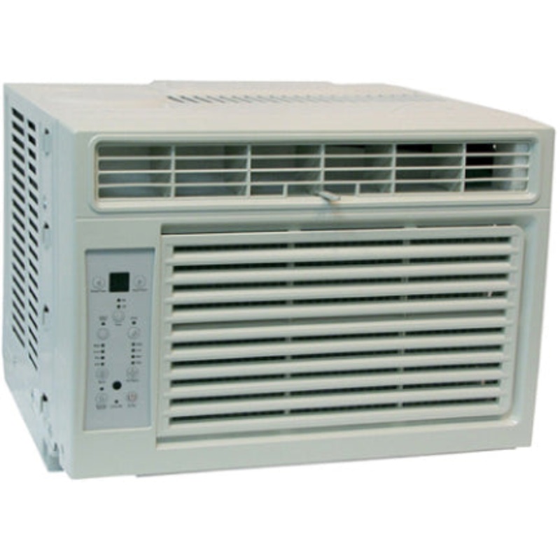Window air conditioner. 6000 BTUs cooling capacity. EER 10.7. Covers 250 sq. ft. Automatic restart. Remote control. Includes window mounting kit. White. Size 12.3 x 16.3 x 15.8.