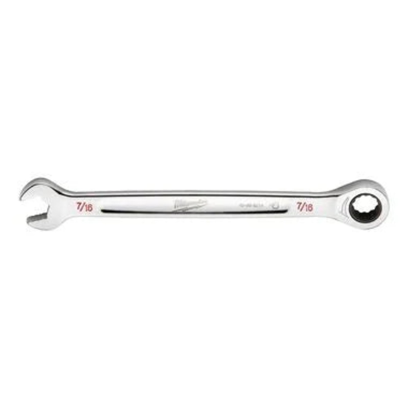 Our SAE Ratcheting Combination Wrenches feature 2.5 degrees of arc swing and 144 ratcheting positions, allowing quick and efficient work in tight spaces. This wrench has double-stacked pawls within the ratcheting mechanism, which increases durability and extends the life of the tool. The MAXBITE Open-End Grip improves the wrench’s grip on nuts and bolts, offering 25% more torque than smooth-faced wrenches. The combination wrench features an ergonomic I-Beam handle design for improved comfort and ink-filled size labels for easy size identification and quick distinction between SAE and metric sets. The MILWAUKEE SAE wrench sizes range from 1/4″ to 1″ and feature a Lifetime Guarantee.