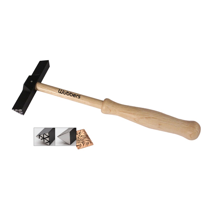 8-1/2" Wubbers Artisan's Mark Triangle Outer Texture HammerThe Artisan's Mark Triangle Outer Texture Hammer by Wubbers has the point of the triangle turned upwards, away from the handle. One face of the hammer has a crisscross pattern of lines which gives