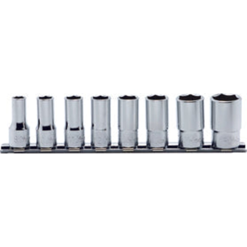 The Ko-ken RS3300X/8 is an 8-piece 3/8″ square drive semi-deep chrome metric socket set featuring 6-point openings for a secure grip on fasteners. This set includes sizes 8mm, 10mm, 11mm, 12mm, 13mm, 14mm, 17mm, and 19mm. Each socket is mounted on a 200mm rail, providing easy organization and accessibility. Ideal for mechanics and DIY enthusiasts, this set offers durability and precise fitment for various applications.