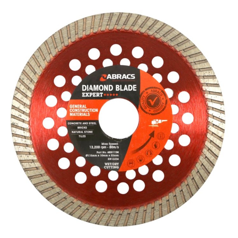 Abracs expert line General Construction materials diamond blades are suitable for cutting virtually all construction materials including steel and reinforced concrete. The 10mm continuous segment eliminates chance of segment loss and cooling hole technolog