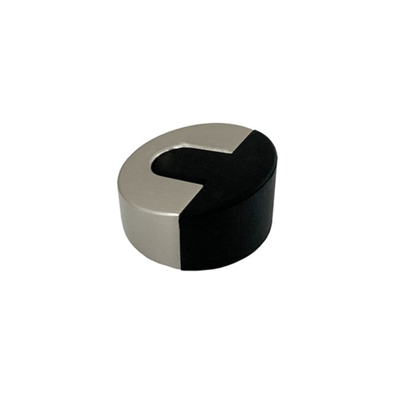 Stylish and Architectural Door StopsProtect your walls from swinging doors with this round-shaped doorstopRubber stopper to cushion the blow and protect the door from damageMetal inserted in a u-shape around rubberSolid, zinc alloy construction with satin