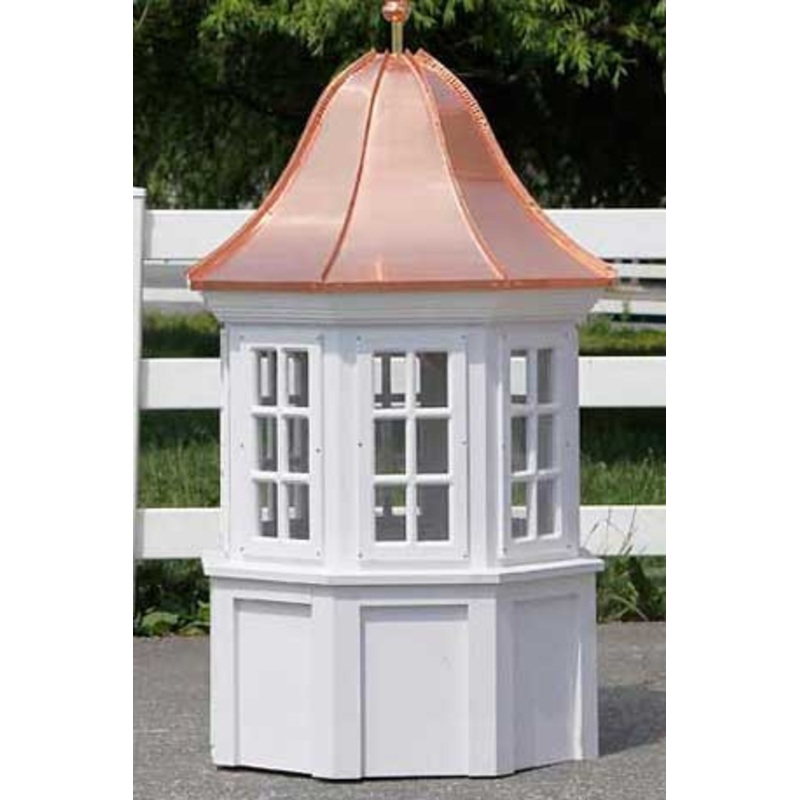 This cupola is available in maintenance-free vinyl and is weathervane ready with a 3/4 inch rod opening.Designed for up to a 8/12 pitch.Cupola roof is covered with standing seam copper or metal roofing is available.