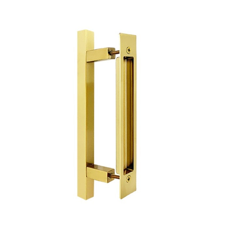 Brushed brass finish barn door hardwareListing is for a back-to-back pull and handle300mm square door pull handle from the outside, made of 304 grade stainless steel250mm x 38mm sliding door flush pull from the inside, made of zinc alloyStraightrecessed fl