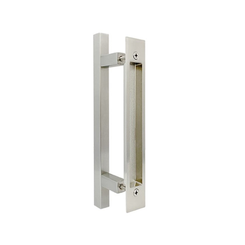 Stainless Steel finish barn door hardwareListing is for a back-to-back pull and handle300mm square door pull handle from the outside, made of 304 grade stainless steel250mm x 38mm sliding door flush pull from the inside, made of zinc alloyStraight recessed