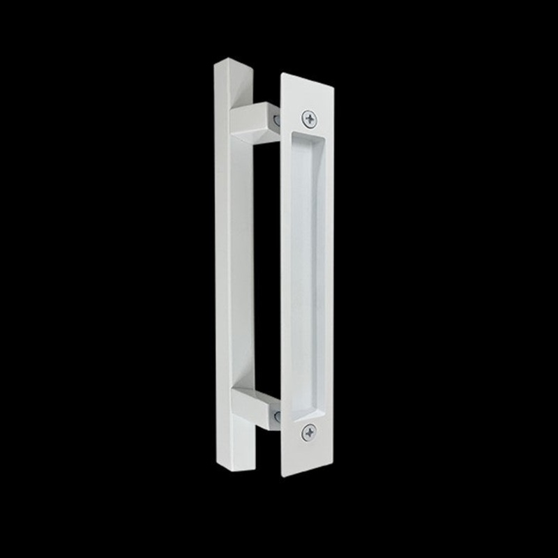 White finish barn door hardwareListing is for a back-to-back pull and handle300mm square door pull handle from the outside, made of 304 grade stainless steel250mm x 38mm sliding door flush pull from the inside, made of zinc alloyStraightrecessed flush pull