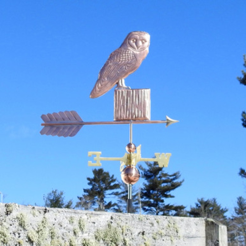 Barn Owl Weathervane - Made in USA Behold the majestic Copper Barn Owl Perched on Post Weathervane, a true testament to American craftsmanship and artistry. This exquisite piece, meticulously handcrafted in the USA, is fashioned from genuine copper that wi