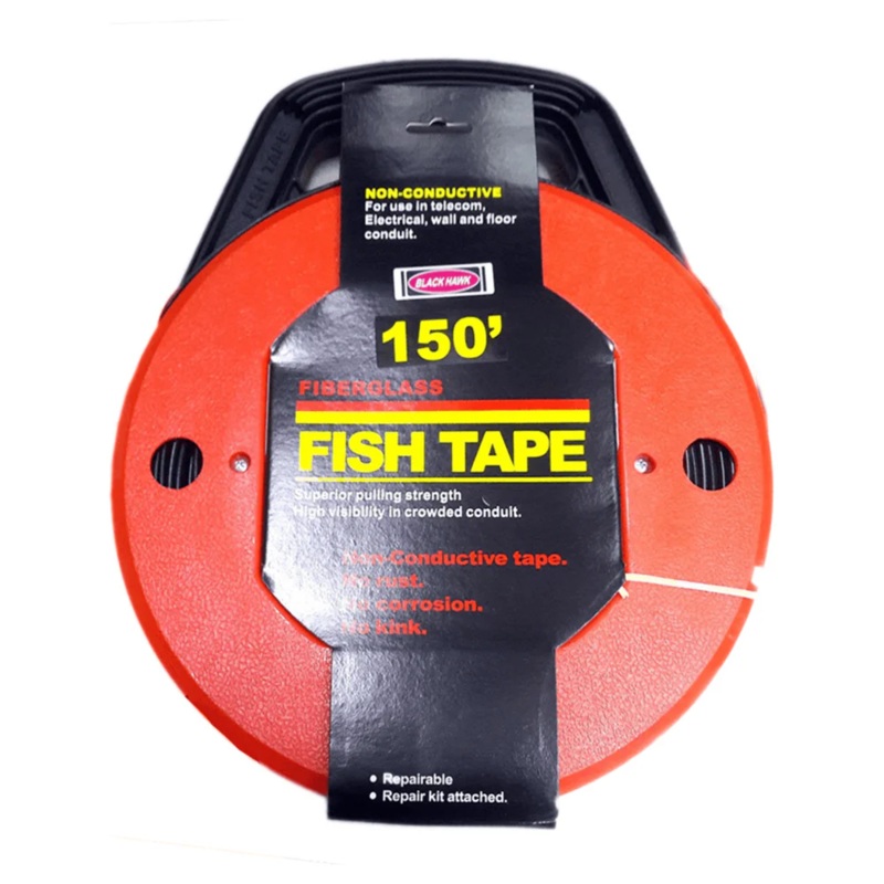 Black Hawk Fish Tape with Case/CageApplications:For use in telecom, Electrical, wall and floor conduit.Non-Conductive TapeNo RustNo CorrosionNo KinkModelSizePrice0310AA (Case) [Steel]3.2mm x 30m1,280.000315FAH (Case) [Fiberglass]3.8mm x 45 m3,450.000320AA