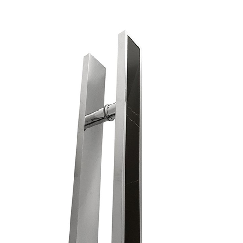 DescriptionA chic metal and stone handle for large, heavy doorsListing is for one pair of door pulls (back-to-back)Made of Grade 304 stainless steel with a polished chrome finish and black stone inlayWidth of handle 80mm, with thickness of 25mmProjects 70m