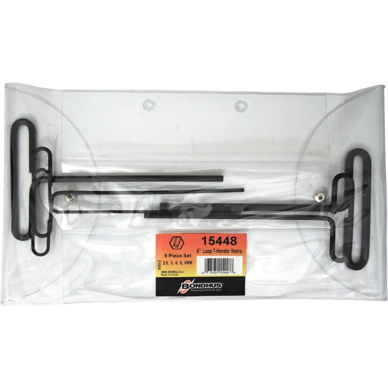 General InformationBrandBondhusPart Number15432Product TypeT-Handle DriversNumber of Pieces8PackagingBulkCountry of OriginUnited StatesUPC37231154325California ResidentsProposition 65 WarningPhysical CharacteristicsWeight0.34 kg0.76 lbFinishProGuard finishDetailsTip TypeHexSize3/32, 7/64, 1/8, 9/64, 5/32, 3/16, 7/32, 1/4 InchesFeaturesChamfered tool tips eliminate burrs and help tools seat in screw head Sharp corners transfer more torque to the screw and reduce stripping