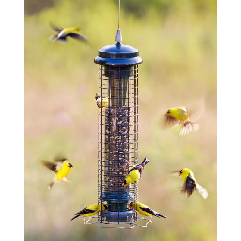 Swivel HangerRemoveable base and coverSeed tray accessory availableTRULY SQUIRREL PROOF: Openings in the shroud align with the feeding ports, providing birds access to the food. When a squirrel climbs onto the feeder, its weight automatically forces the sh