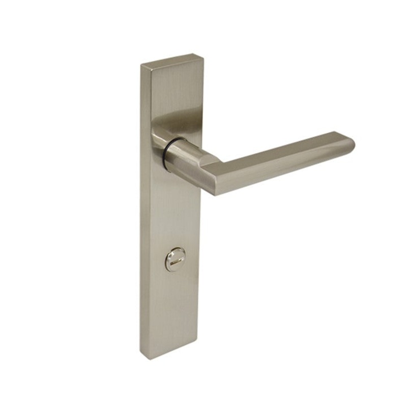 Solid slim profile door handle mounted on a long rectangular face plateFace plate 42mm wide x 200mm longSolid zinc alloy construction with a satin nickel finish (brushed stainless steel)Suitable for both left and right-hand opening doorsSuitable for door t