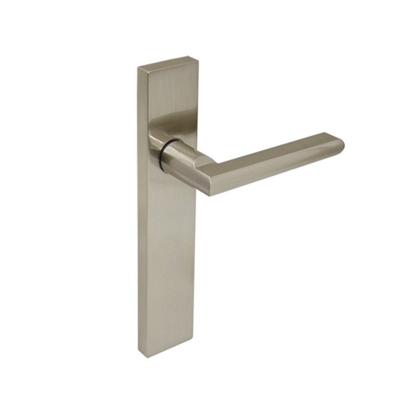 Solid slim profile door handle mounted on a long rectangular face plateFace plate 42mm wide x 200mm longZinc alloy construction with a satin nickel finish (looks like brushed stainless steel)Two mounting screws and washers includedSuitable for 35mm to 45mm