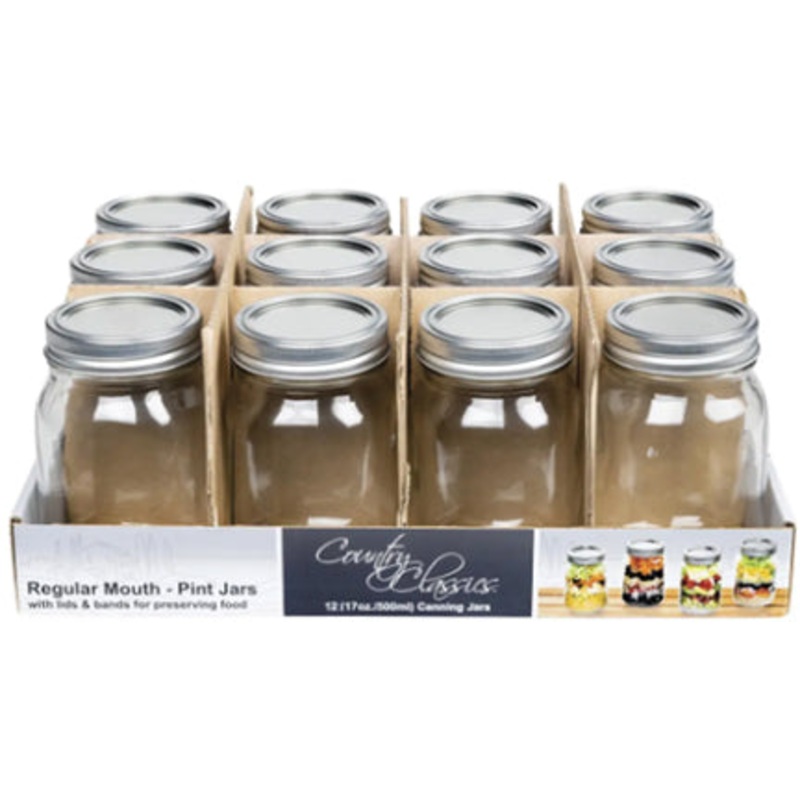 12 Pk. of 1 Pint (16oz.) Glass Canning Jars with Regular Mouth Lids and Bands. Perfect for preserving any foods. It does not stop there though, these jars can be used for any craft as well. Set comes with 12 jars, 12 lids and 12 bands ready for your next canning project.