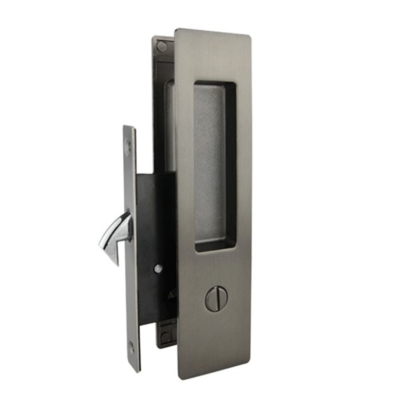 Description180mm x 45mm faceplateTwist snib lock inside and emergency opener outsideZinc alloy construction with gunmetal finishComes with matching colour of mounting screws, a hook lock and hook plateSuitable for both left and right hand sliding doors 35m