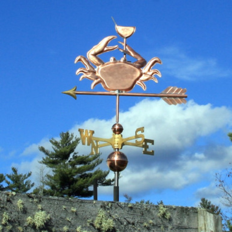 Crab Weathervane Made in USA Transform your outdoor space into a whimsical wonderland with our stunning 3D Copper Crab Weathervane, a true masterpiece of American craftsmanship! This majestic crustacean, proudly holding a martini glass in its claw, adds a