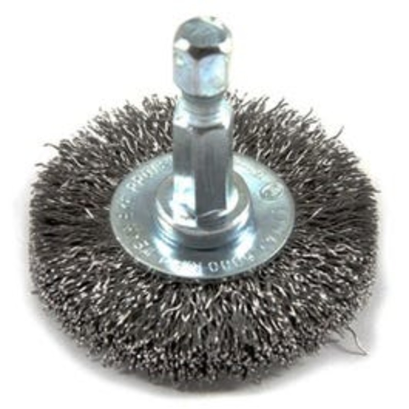 Stem mounted 1-1/2" 'fine' wire wheel brush with 1/4" (6.35mm) hex shank. designed for easy access into narrow holes and confined areas. crimped style for light to medium duty applications. removes rust, scale and paint in hard to reach areas. use with any