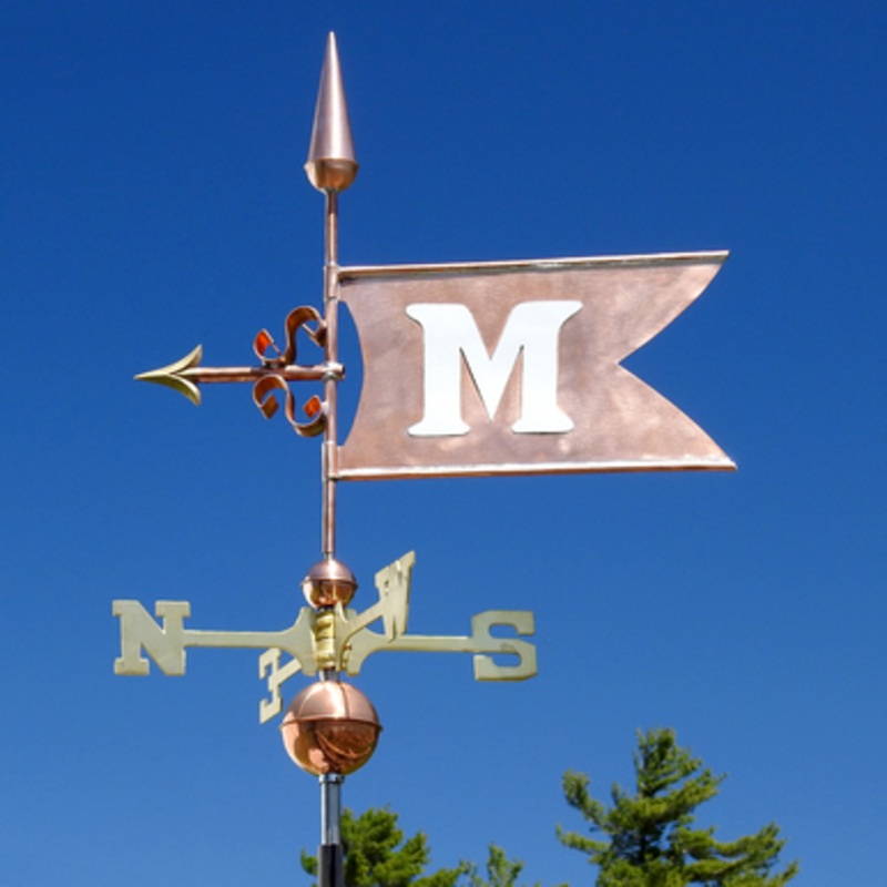 Custom Banner Weathervane Made in USA Elevate your outdoor space with our Custom Banner Weathervane, a stunning blend of artistry and functionality handcrafted right here in the USA. Made from durable copper, this weathervane not only serves as an eye-catc