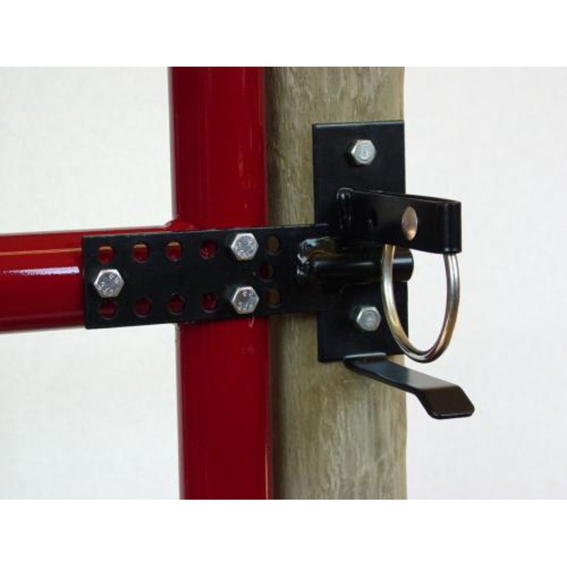 One way universal gate latch. Works on wood, tube, galvanized metal, chain link, ornamental and more. Self latching one handed operation, locks securely with or without padlock.