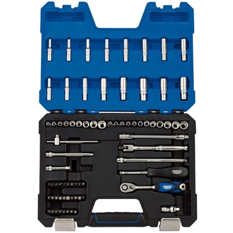 Expert Quality, six point sockets made from chrome vanadium steel that's hardened and tempered with a micro satin finish. Each socket has a knurled ring for extra grip. Supplied with a 72 tooth reversible soft grip ratchet and accessories. Packed in tough