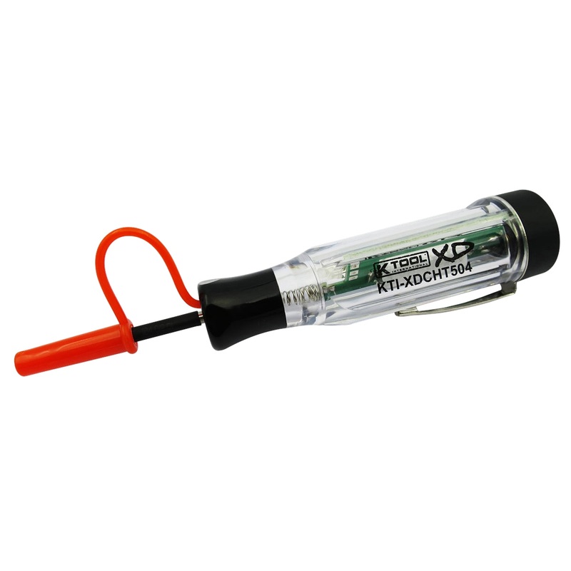 Quickly detect DC voltage on automobiles, trucks and motorcycles ranging from 3-30V DC without the need for a connection to ground using the new xtra duty cordless circuit tester (part no. KTIXD-CHT504) from K-Tool). Made with an audible beep and dual color LED lights that alerts the user to DC voltage presence, red for power and green for ground. Designed with a clear body to easily view the indicator lights so you know right away whats hot and whats not. The stainless steel testing probe delivers a reliable reading every time and when not in use. This tester has an attached tip protector, built-in 3.6V lithium battery that allows a 30 hour minimum run time. Its compact size can be used in tight access areas with no cord interference and store in your pocket with the convenient metal pocket clip.