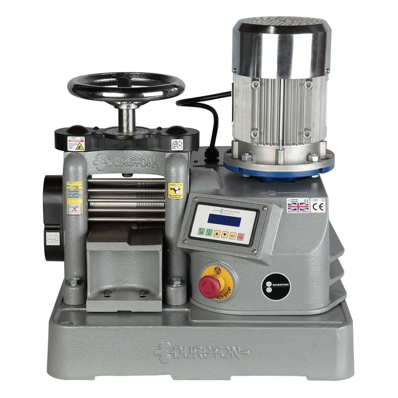 Rolling mills are designed to gradually reduce metal stock thicknesses to achieve the exact gauge size for your work. Durston Rolling Mills are compact, yet have everything you need to form metals. The DRM C130 Powered Rolling Mill is constructed from cast iron for optimal strength and rigidity. It is a combination rolling mill that is ideal for both flat metal and square wire powered milling. The motor is powerful enough for continuous operation, which is why Durston Tools mills have such a long working life. This versatile package has variable speeds from 5 to 20 RPM and a highly efficient, near-silent operation. The rolls are especially induction hardened to 64RC; the main barrel has a depth of 6 mm, ensuring that your rolls last a lifetime. The rolls themselves are combination rolled providing both flat and square wire rolling. The mill includes 11 square grooves of wire rolling from 8 mm to 1 mm. Side extension rollers offer a total of four half-rounds of 4, 3, 2, and 1.5 mm. Safety features include an emergency stop button, safety bars at the front and rear of the mill, guards covering the extension rollers, as well as guards covering the top gears. Part of Durston Tools award-winning range of products available since 1961. We highly recommend that your Durston Tools rolling mills are securely fastened down for safety. Freight shipping required, please contact us at (855) 298-7627 for pricing.