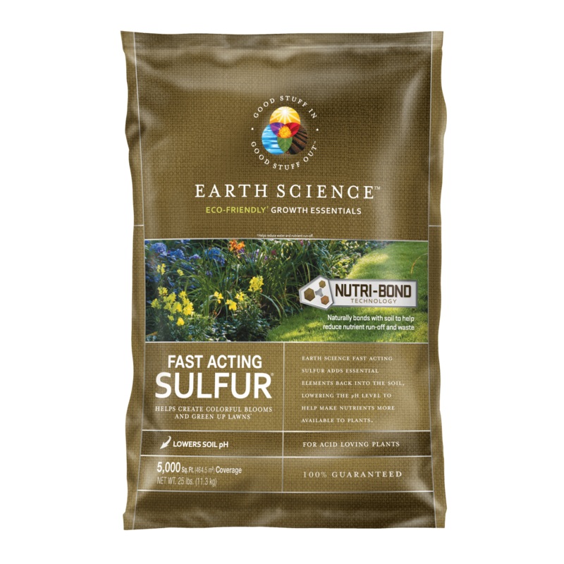 Earth Science Fast Acting Sulfur starts working immediately to naturally lower the pH of your soil. Acid-loving plants require a low pH soil environment to thrive (between 4.0 and 5.5). Most other plants perform best when soil pH is between 6.2 and 7.2. When used as directed, Fast Acting Sulfur helps your plants absorb more food and improves fertilizer effectiveness for a lush green lawn and colorful garden.