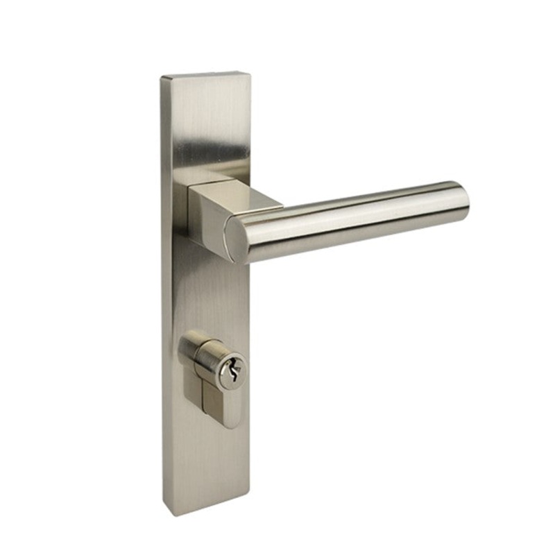 Solid round profile door handle mounted on a long rectangular face plateFace plate 42mm wide x 200mm longSolid zinc alloy construction with brushed stainless steel finishSuitable for both left and right-hand opening doorsSuitable for door thickness from 35