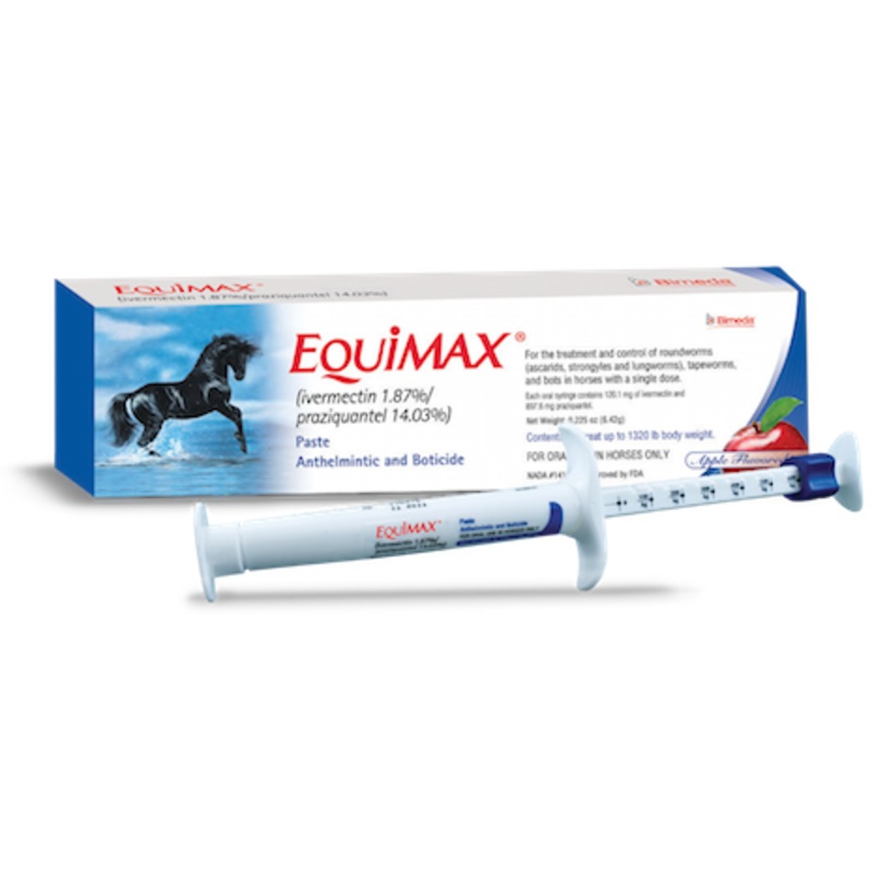 FOR ORAL USE IN HORSES 4 WEEKS OF AGE AND OLDER. EQUIMAX(ivermectin/praziquantel) Paste should not be used in other animal species as severe adverse reactions, including fatalities in dogs, may result. Do not use in horses intended for human consumption. Swelling and itching reactions after treatment with ivermectin paste have occurred in horses carrying heavy infections of neck threadworm (Onchocerca sp.microfilariae), most likely due to microfilariae dying in large numbers. Not for use in humans. Ivermectin and ivermectin residues may adversely affect aquatic organisms, therefore dispose of product appropriately to avoid environmental contamination. Trademarks belong to their respective owners.