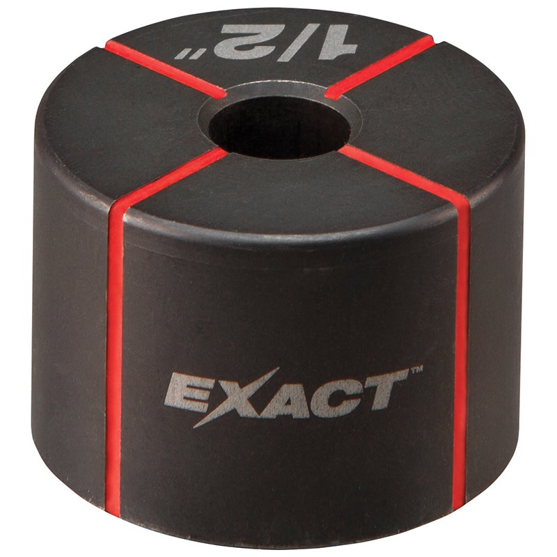 EXACT punches and dies have innovative features which bring value for the contractor. Heavy duty, they can punch holes in both mild and stainless steel material. Laser engraved cross hairs on the dies deliver clearest alignment with pre-drawn cross hairs. Both the tooth geometry of the punches, and slug removal ports on the dies, provide optimal slug removal. Large size ID markings on both the punches and dies permit easy punch and die selection. EXACT punches and dies do not require spacers. Finally, notches on the punches allow for better grip during punch threading and de-threading. Altogether, EXACT punches and dies make the knockout process easier!