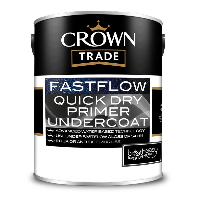 Crown Trade Fastflow Quick Dry Primer Undercoat is a water-based primer undercoat with excellent coverage and quick drying properties, specially formulated for use with Crown Trade Fastflow Quick Dry Gloss, to achieve a smooth gloss finish.