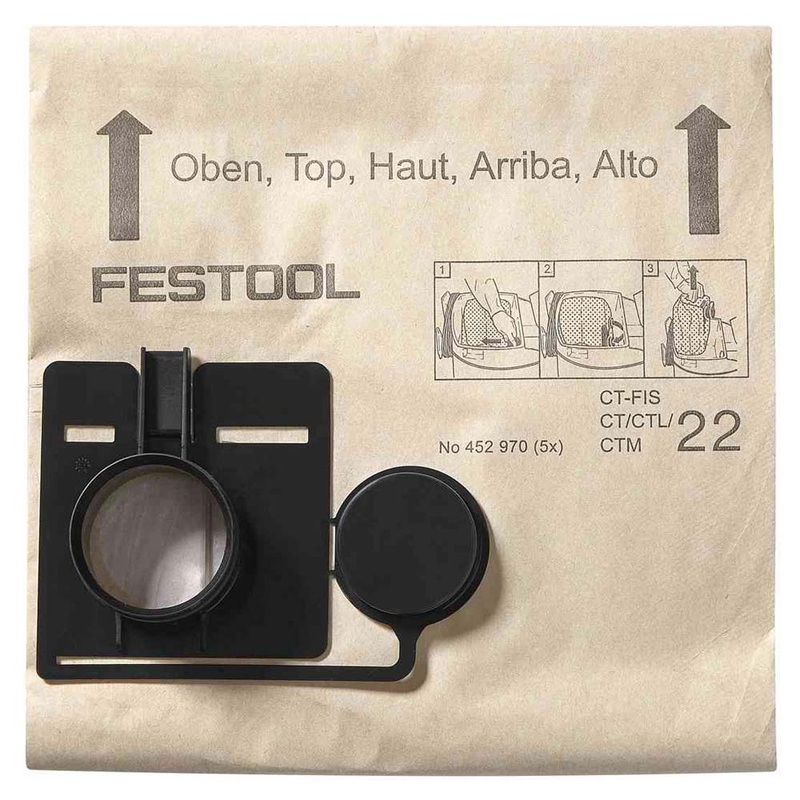 Replaceable paper filter bag forthe Festool CT 22 Dust Extractor. Filter bag captures and contains 5.3 gallons of dust and debris, helping you work cleaner and more efficiently. The cleanest and fastest way to contain dust and dispose of it completely. Festool filter bags act as the primary, or first stage filter, trapping particles down to 5 microns in size.