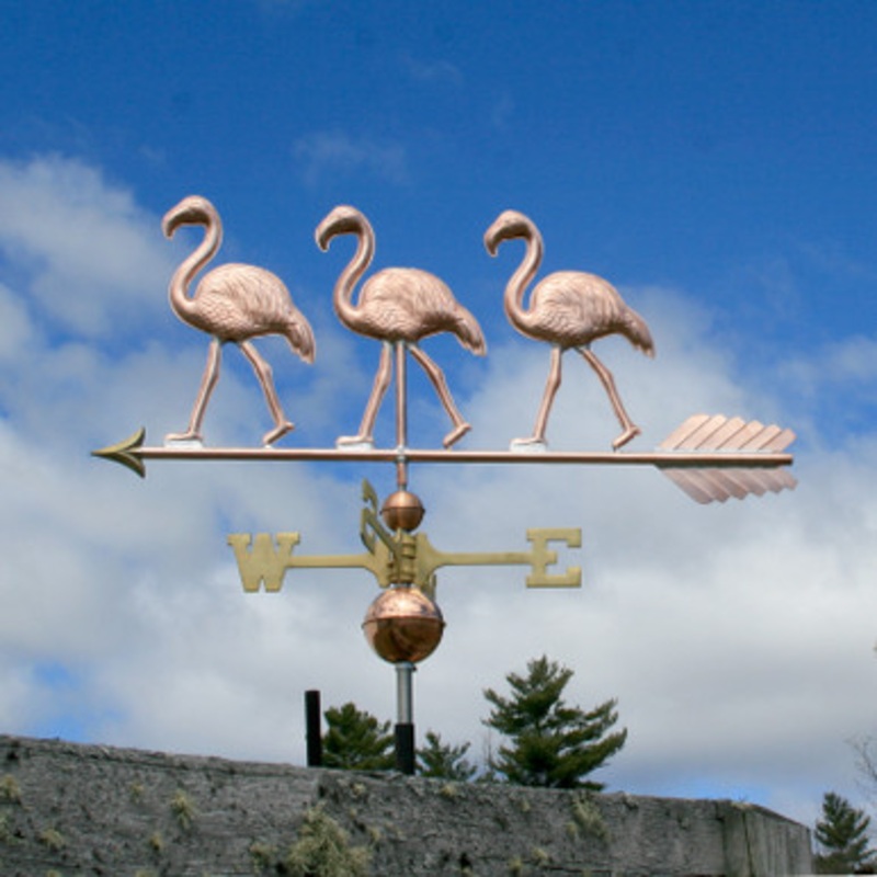 Three Flamingos Weathervane Made in USA Elevate your outdoor space with our stunning Flamingo Weathervanewhere whimsy meets durability! Crafted from heavy-duty copper, this eye-catching 3D design features three vibrant flamingos that will dance atop your s