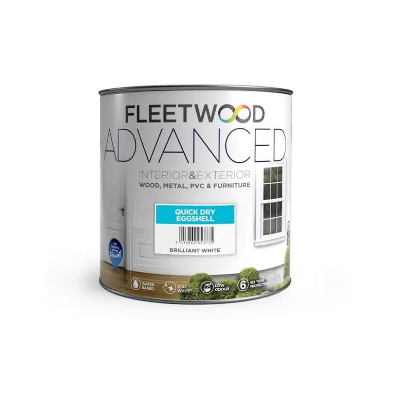 Fleetwood Quick Dry Advanced is a high-quality interior / exterior coating employing a specially developed hybrid system combining modified alkyd emulsion with an acrylic emulsion specially formulated to give all the application and appearance characteristics of a traditional trim paint with the added advantage of being quick drying and of low odour during application. Touch dry in 30 minutes. The Eggshell White shade adds a timeless elegance to any space, creating a bright and fresh atmosphere. Whether you’re tackling trim, doors, or furniture, trust Fleetwood for superior performance and lasting beauty.