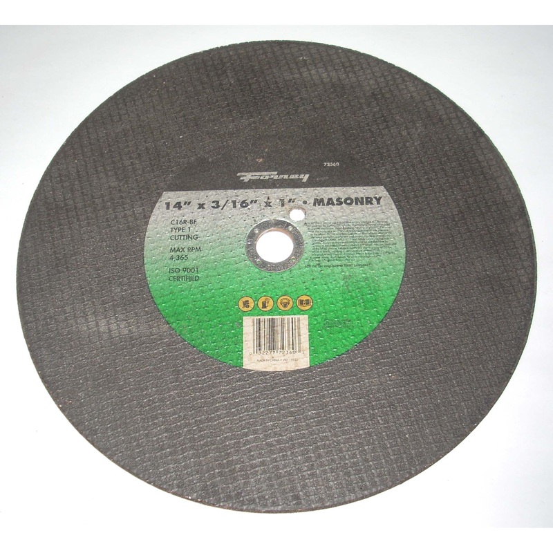 Forney part number 72360 masonry cut off wheel for high speed gas powered cut off saws. The size is 14 x 3/16 x 1. The maxiumum RPM is 4365. This cut off wheel is excellent for cutting concrete, brick, and rock.