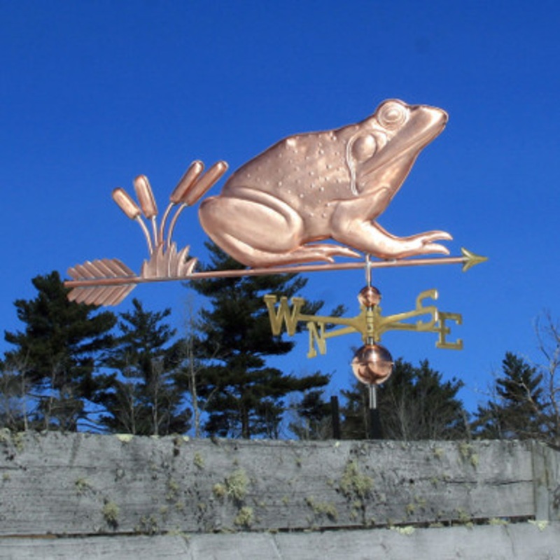 Our Frog Weathervane also comes ready to fit any of our cupolas we sell. To mount the copper weathervane into one of our cupolas all you have to do it put the solid weathervane rod down through the top of the cupola and through an internal crossmember inside the roof of the cupola. Use a little caulking around the hole to seal the rod and cupola together.